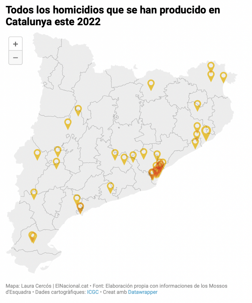 L’any 2022 a Catalunya es van registrar 42 crims, en 365 dies. D’aquests, catorze es van registrar a la ciutat de Barcelona. Si aquestes dades es comparen amb l’any 2021 hi ha hagut deu assassinats menys.