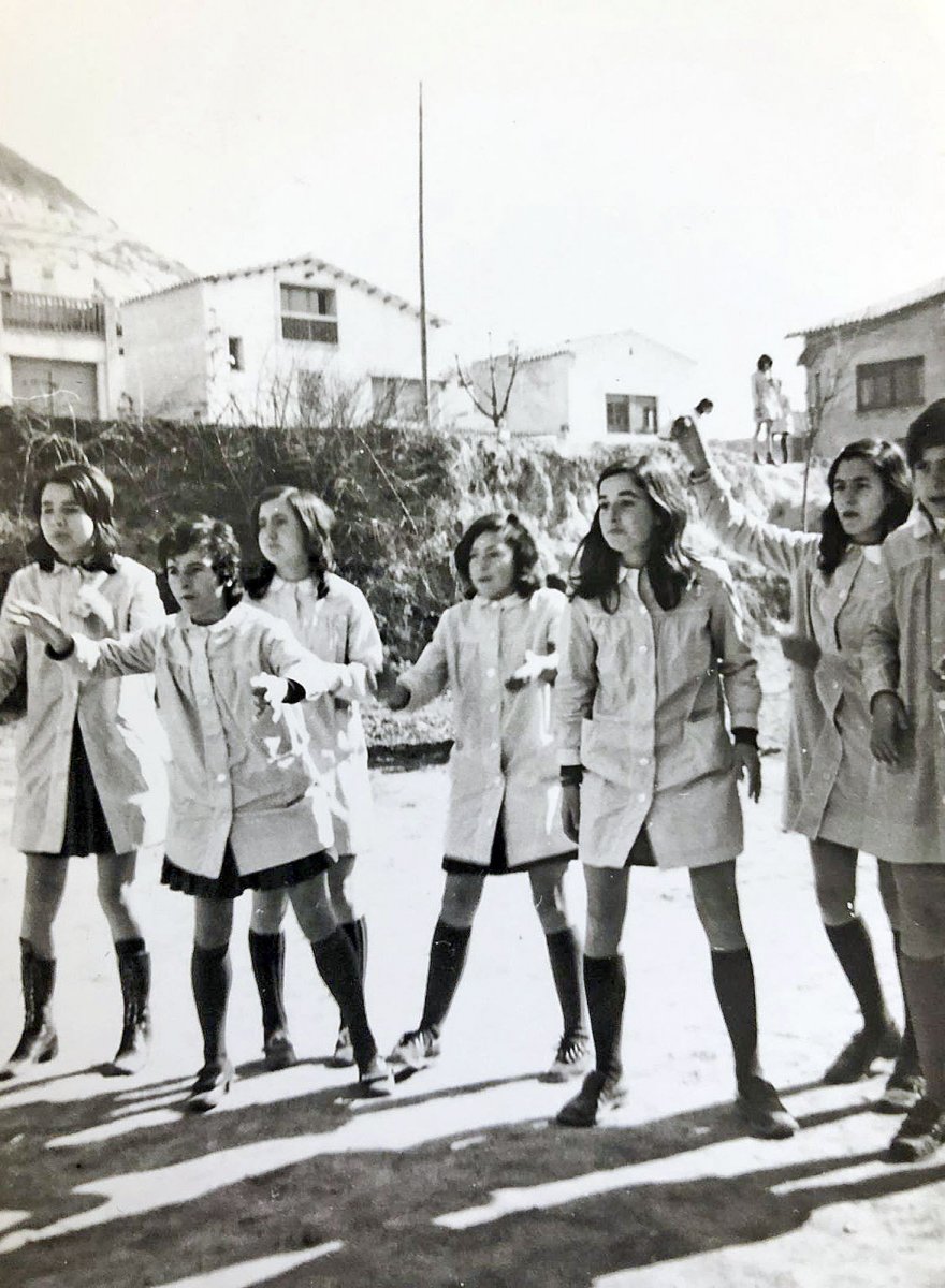 Malgrat fer l’etapa escolar encara durant el franquisme, recorden, “el Cara al sol no l’havíem cantat mai”, i de fet l’ensenyament era en castellà però “entre nosaltres i els mestres parlàvem sempre en català”. La religió sí que tenia pes. Per exemple, cada vegada que algú encenia el llum de l’aula totes deien “Alabado sea Dios y alabado sea su santo nombre”. I amb el llum també havien fet alguna malifeta, com desenroscar les bombetes i posar-hi una moneda i això feia que hi haguessin d’anar els electricistes, “els únics homes que entraven” a l’escola, que era només per a nenes. Al final de Batxillerat, però, ja van tenir algun professor, i de fet fins i tot recorden que van demanar a les monges de fer una xerrada d’educació sexual i ho van acceptar. I al final del quart curs també recorden que sota la finestra hi anaven un parell de nois que rondaven dues companyes. De nois, en veien pocs, només en trobades amb altres escoles que vivien de forma especial o quan ells les anaven a veure a les exhibicions de final de curs i feien verticals, sempre amb bombatxos sota la faldilla.