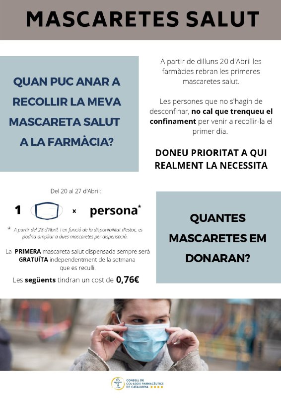 Per aconseguir la mascareta cal presentar la targeta d’identificació sanitària. La primera de les mascaretes serà gratuïta i les següents costaran 0,76 euros. En un primer moment i per garantir que tothom en tingui, només es podrà aconseguir una mascareta.