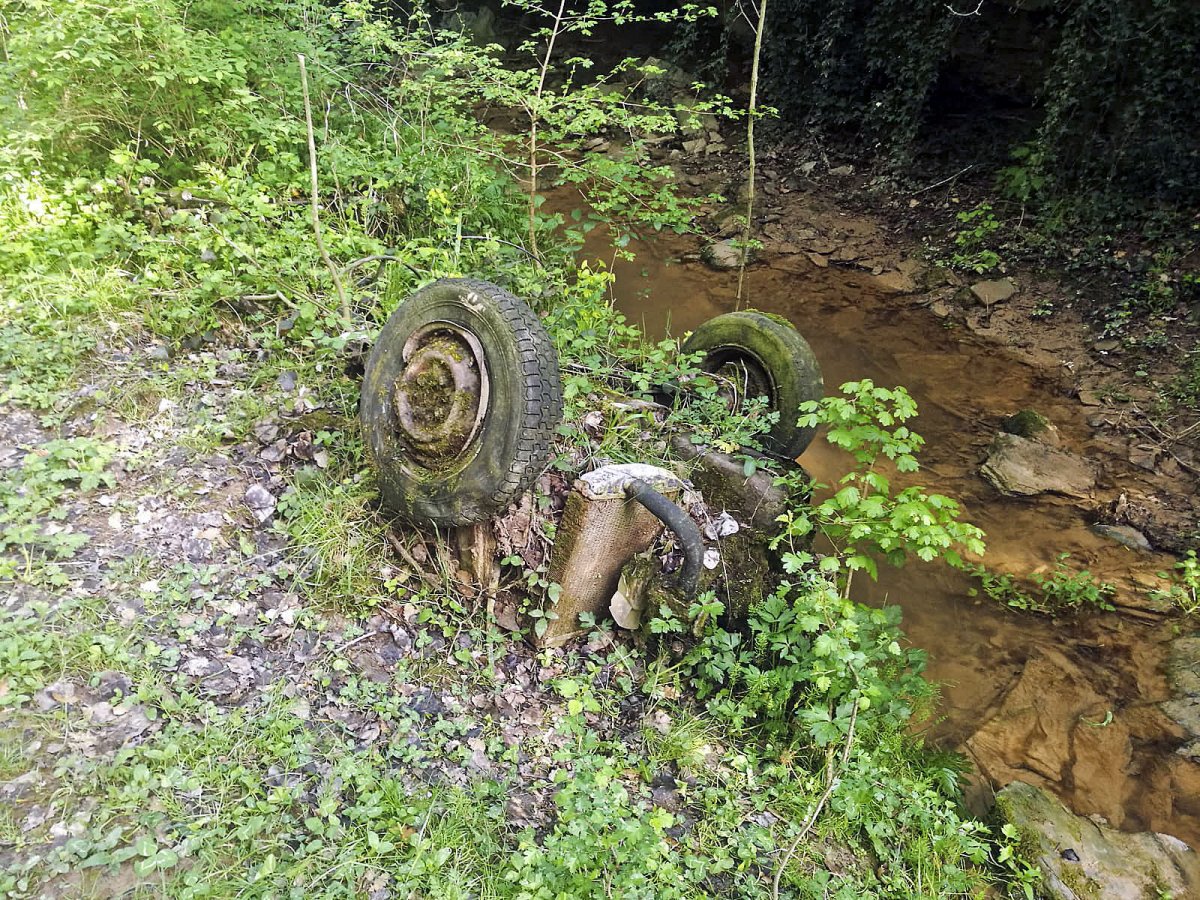 S’ha convertit en un element més del Gorg de la Truja. Aquest cotxe, avui semienterrat, se’l van endur d’estranquis d’una casa joves del poble. Es van estavellar en plena gamberrada, fa més de tres dècades, i com que era vell el propietari tampoc es va molestar a retirar-lo.