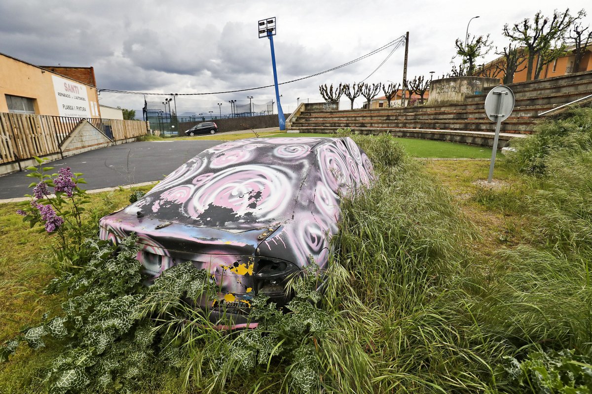 Un quadricicle, un petit cotxe de dues places, dels que es poden conduir sense carnet, és des de fa anys encastat en un arbre, al costat d’un camp del camí de Can Pesseta, un cop passat el pont sota la variant i la granja. Hi ha qui n’ha aprofitat la part elèctrica i tampoc hi queden els vidres.