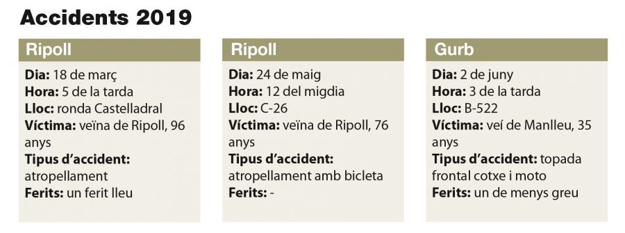 Ara per ara, a Osona, en aquests sis mesos de 2019, només s’ha arribat a un 8,3% del total d’accidents mortals que es van produir l’any passat, amb un motorista mort el passat mes de juny. Al Ripollès, malgrat que la xifra és baixa, amb dues víctimes des de principi d’any, són els primers casos des de finals de 2017, ja que durant tot l’any passat que no hi va haver cap mort a les carreteres de la comarca.