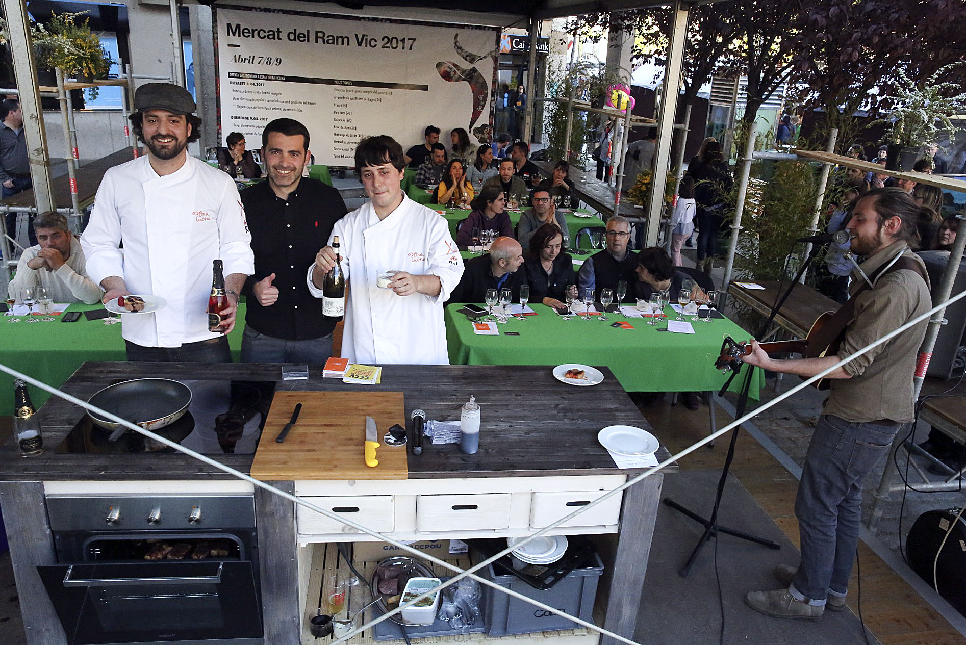 Els cuiners osonencs Jordi Arumí i Albert Reniu van ser els encarregats d’elaborar tres propostes gastronòmiques que una vintena de comensals van poder degustar en un menjador improvisat a la Plaça del Carbó.