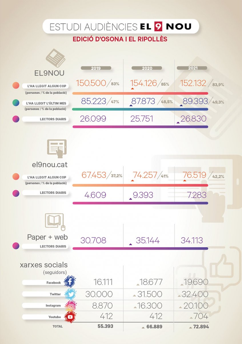 Un de cada dos osonencs i ripollesos majors de 15 anys ha llegit alguna de les edicions d’EL 9 NOU del darrer mes i gairebé el 84% de la població l’ha fullejat alguna vegada l’edició impresa del diari. Tot i les dificultats que viu el sector de la premsa escrita en general, l’últim estudi d’audiència elaborat per l’empresa Infortécnica-Audimedia mostra unes xifres de seguiment dels mitjans del Grup EL 9 NOU molt elevades. El nombre de lectors de cada edició se situa en les 26.830 persones, que hi destinen un temps mitjà de 7,8 minuts al dia, que equival al 38,1% del que la gent dedica a llegir la premsa. Deixant de banda les xifres de l’any 2020, que van venir condicionades per la pandèmia i el confinament, la línia de l’audiència del diari és clarament ascendent. I és també un lector molt heterogeni tant pel que fa al sexe com l’edat, ja que també el 82,3% dels menors de 35 anys asseguren haver llegit EL 9 NOU. L’estudi es va fer a través de 306 enquestes telefòniques a la població major de 15 anys de les dues comarques entre els mesos d’octubre i desembre de l’any passat.