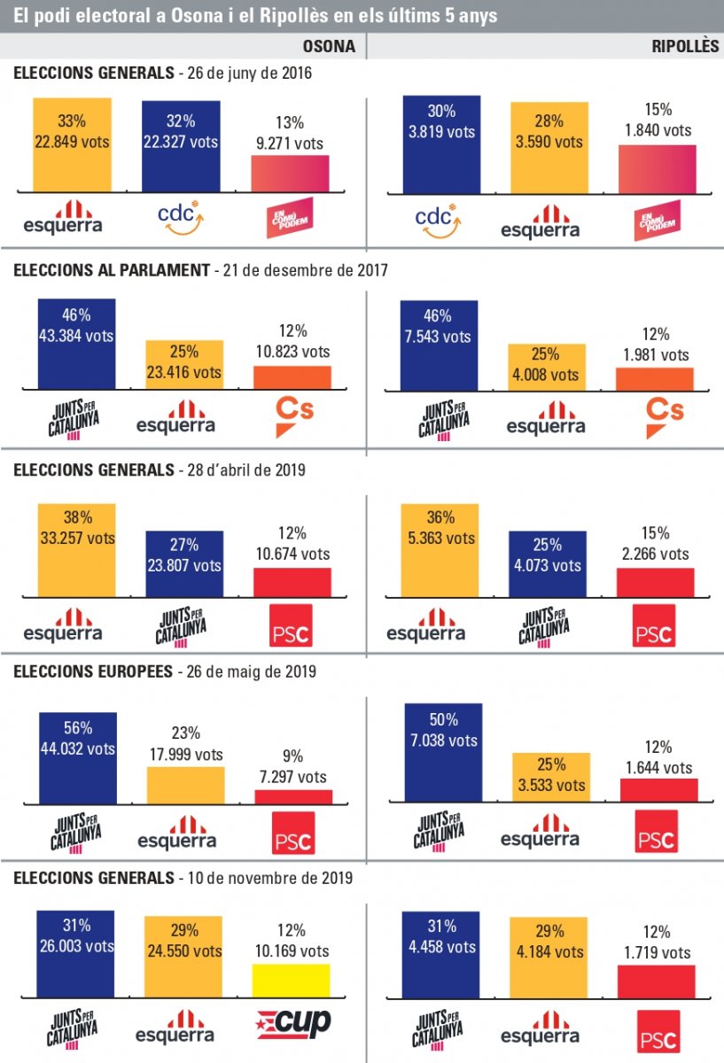 Entremig, a les eleccions generals de l’abril de 2019, Esquerra va aconseguir una victòria clara tant a Osona (amb un 38% dels vots) com al Ripollès, assolint un percentatge del 35%. El darrer referent que tenim són les eleccions generals del novembre de 2019. A les dues comarques es va imposar JxCat però amb una diferència en percentatge de vots respecte a Esquerra idèntic: dos punts.