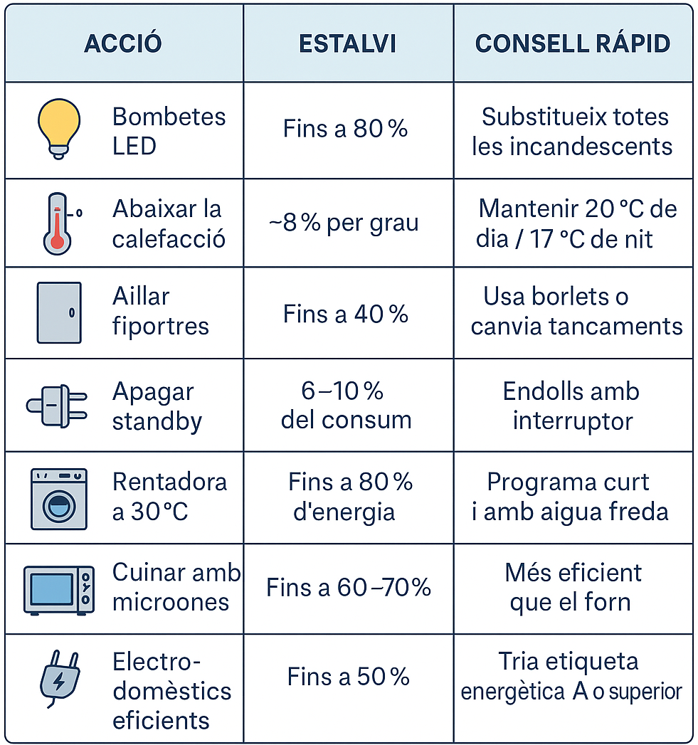 En l’àmbit domèstic, es fa èmfasi en la necessitat de reduir el consum energètic i millorar-ne l’eficiència. En aquest sentit, s’aconsellen mesures com l’aïllament de la façana per evitar pèrdues d’energia i la instal·lació d’una bomba de calor -aerotèrmia-, tant per escalfar i refrigerar l’habitatge com per generar aigua calenta sanitària. Aquesta tecnologia, cada cop més accessible, és molt més eficient que les alternatives convencionals.