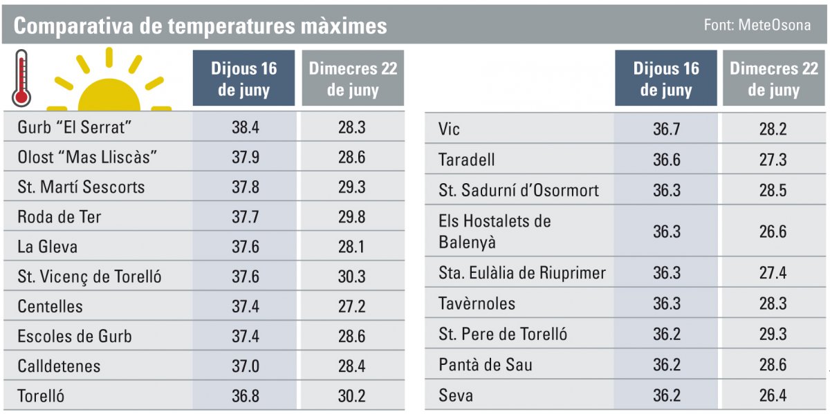 Malgrat acumular registres poc importants, una mitjana d’entre 10 i 15 litres per metre quadrat en funció del municipi, les pluges de dimarts al vespre han refrescat l’ambient. Osona i el Ripollès es van llevar l’endemà amb temperatures uns quatre graus per sota de les del dia anterior i diametralment oposades a les de l’onada de calor de fa només una setmana. Aquests canvis meteorològics han contribuït a rebaixar l’elevat risc d’incendi i la Generalitat ha descartat tant prohibir els petards durant la revetlla de Sant Joan com aplicar restriccions generalitzades arreu de Catalunya. No obstant això, ajuntaments com el de Seva sí que han emès bans municipals recordant que no està permès encendre fogueres ni tirar petards a menys de 500 metres del bosc. Així mateix, es recomana no comprar fanalets voladors ni coets, ja que poden anar-se’n lluny i calar foc tot i que no es vegi des del punt d’enlairement. “Fem una crida a l’autoresponsabilitat i la prudència davant la situació de sequera i l’important episodi d’incendis que hem viscut els últims dies al nostre país”, va dir dimarts la portaveu del govern, Patrícia Plaja.