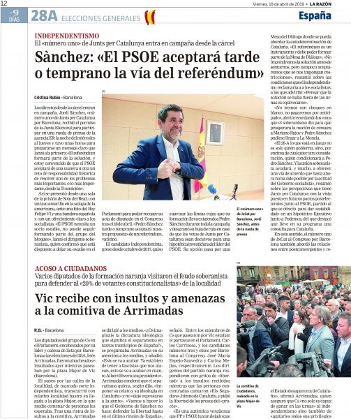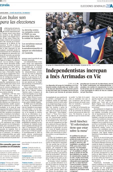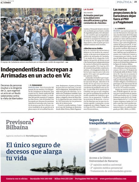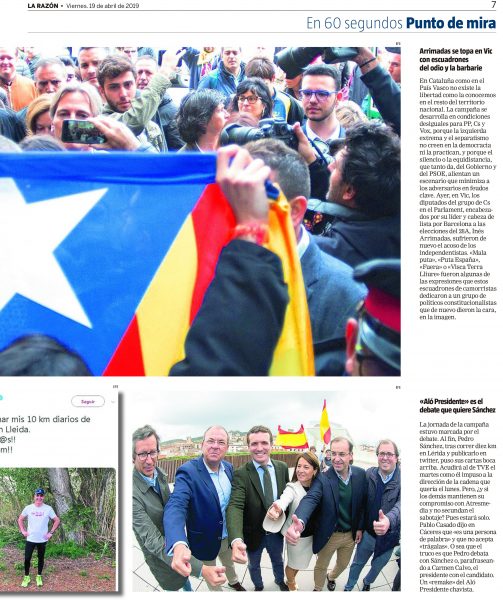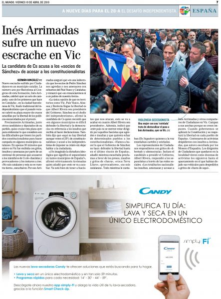 La visita d’Inés Arrimada, acompanyada de la pràctica totalitat dels diputats, dijous a Vic no tenia un objectiu concret. Ni presentava els caps de llista d’Osona a les municipals ni tampoc havia anunciat cap acte de partit. Però va aconseguir un cop més acaparar titulars i fotografies de la seva visita a la ciutat de Vic com fa una setmana ho va fer Albert Rivera a Errenteria. De Vic tots els mitjans editats a Madrid diuen que és una ciutat clarament independentista i la qualifiquen d’intolerant perquè “una cinquantena de persones”, o un centenar eleven els altres, va rebre a la líder de ciutadans amb insults, com feixista, i increpant-la a ella i la resta de la comitiva de Ciutadans. La Razón per exemple diu que va ser rebuda “per esquadrons de l’odi i la barbàrie” i “camorristes”, El Mundo parla que va patir un escratx per part dels manifestants durant el poc més de mitjans hora que va estar a la ciutat. Al vespre, en el míting electoral destacat de la jornada, Arrimada va aprofitar de posar l’exemple de Vic com la intolerància i crispació que viu Catalunya.