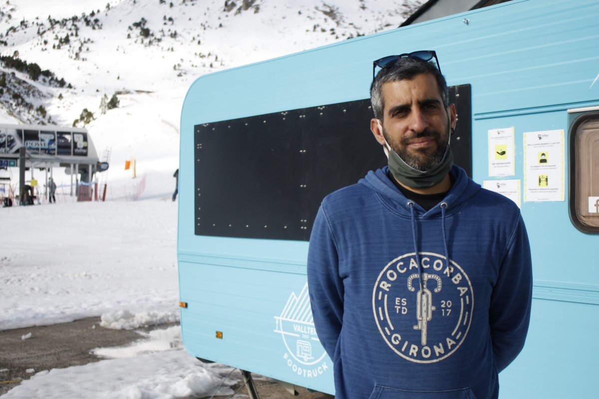 Estel Caminal i Jacint Oliveras, de Sant Vicenç de Montalt (foto 5), estaven asseguts a la neu cap al migdia. Ella en tenia un grapat a la mà que es posava sobre el canell de l’altre braç després d’una caiguda de la taula de snowboard. Feien un dia “sense nens” en què havien arribat el dia anterior amb una furgoneta i havien fet nit a la zona, i s’havien posat a esquiar de bon matí en un lloc on ja van habitualment. Molt a prop d’ells Maties Rodríguez feinejava per tenir a punt la Vallter Foodtruck (4). Comptava obrir aquest divendres, uns dies més tard del que ho fa habitualment, que és pel pont de la Puríssima o per la primera nevada. Tot plegat, assegurava, “és una incertesa, i anem sobre la marxa”, però confiava que a partir de la setmana vinent, amb les vacances escolars, “suposo que treballarem bé”. Deia que “estic tot el dia pendent de la ràdio i aquest matí les dades eren dolentes”, per tant estava a l’expectativa de què pot passar els següents dies, i era conscient que probablement no passarà com els mesos d’estiu quan “vam treballar bé, més que altres anys i tot” perquè a la Vall de Camprodon “hi havia molta gent”.
