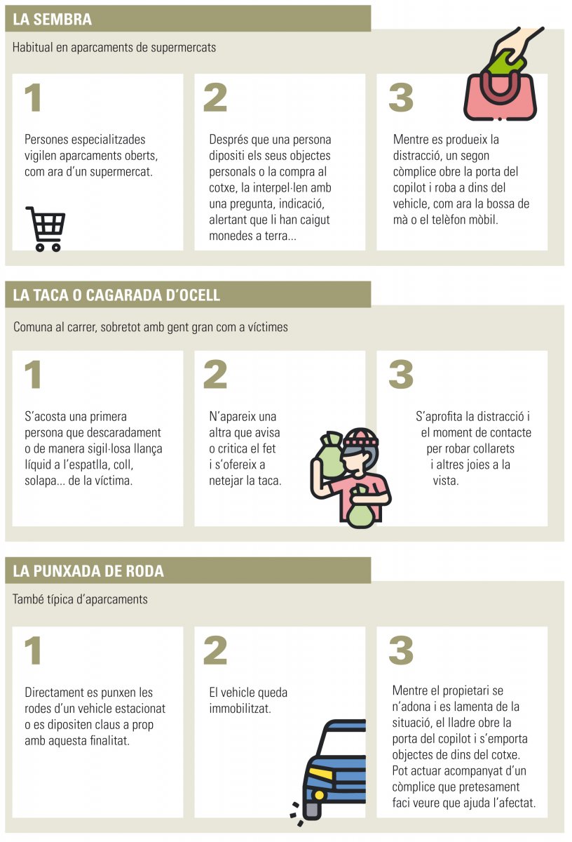 La manera de procedir és sempre la mateixa. Primer de tot, identificar una víctima vulnerable, com ara persones grans o estrangeres; generar una distracció i que sigui aleshores quan un segon integrant de la banda cometi el furt. Si es tracta d’un cotxe, per exemple, endur-se del seient del copilot la bossa de mà, la cartera, el mòbil o un objecte acabat de comprar.
