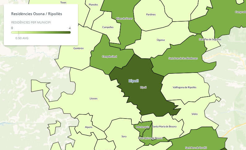 Osona és de les comarques menys afavorides pel que fa a la creació de places per a gent gran, ja que es passa de 744 a 763, un increment del 2,5% que està molt per sota del 5,5% de mitjana de les comarques de Barcelona. Percentualment, s’incrementa més el nombre de places de persones amb discapacitat (de 285 a 298) o amb malaltia mental (de 41 a 45). En canvi, el Ripollès passa de 154 a 160 places per a persones amb discapacitat i de 242 a 255 per a la gent gran, una xifra que estaria en la mitjana catalana. La dada obeeix també a un factor demogràfic, perquè al Ripollès un 25% de la població té més de 65 anys, molt per sobre d’altres comarques; a Osona la xifra és del 17,5%, un punt per sota de la mitjana catalana, que el Moianès sobrepassa lleugerament (19%).