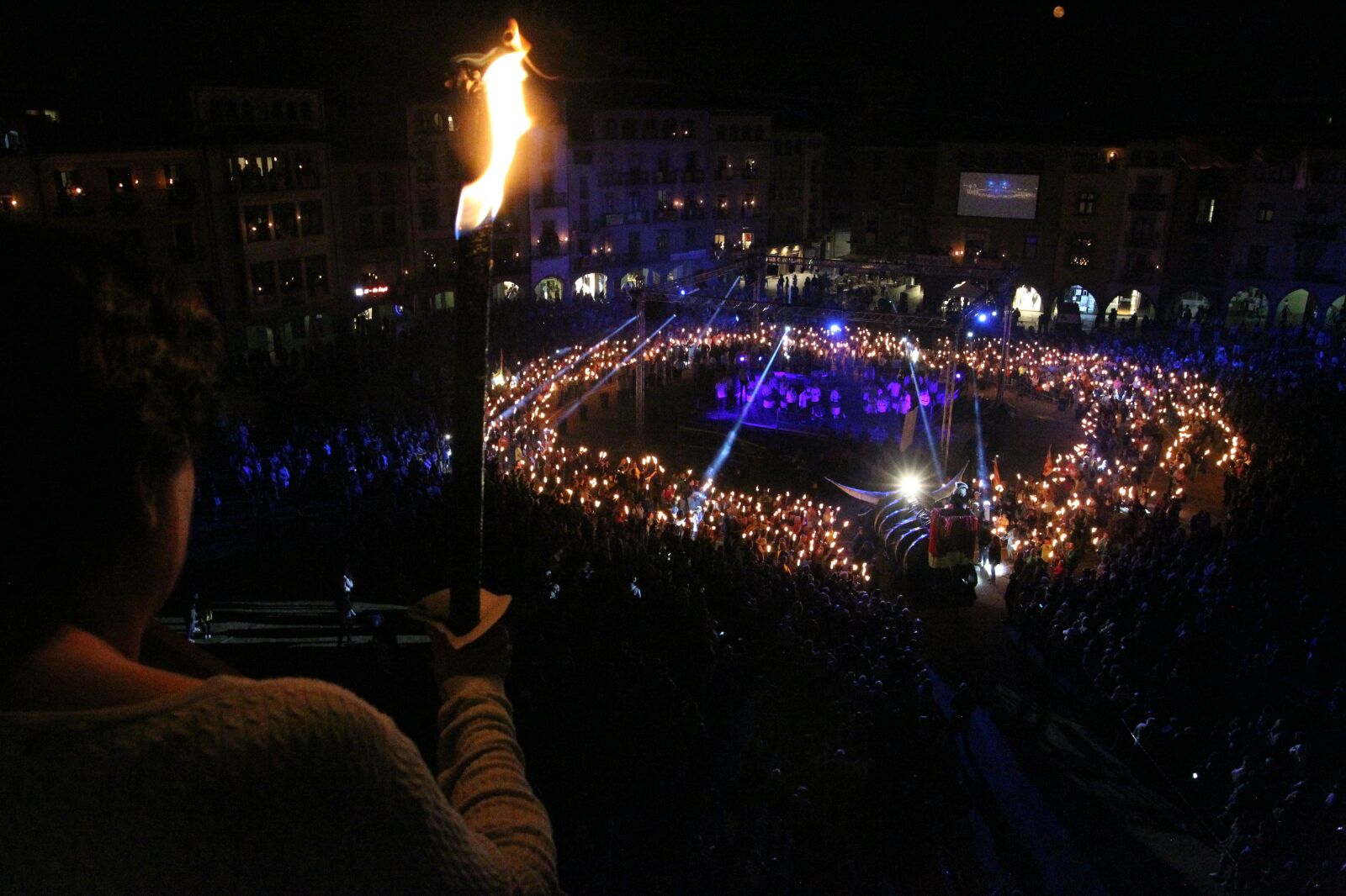Vic ha viscut aquest divendres la quinzena edició de la Marxa dels Vigatans, que des del 2003 commemora a la capital d’Osona els fets de la Guerra de Successió. A l’espectacle, que ha tingut com a protagonistes les torxes i les 26 columnes vingudes de pobles d’arreu de la comarca, hi han intervingut el president de la Generalitat, Carles Puigdemont (via videoconferència), i el president d’Òmnium Cultural, Jordi Cuixart.