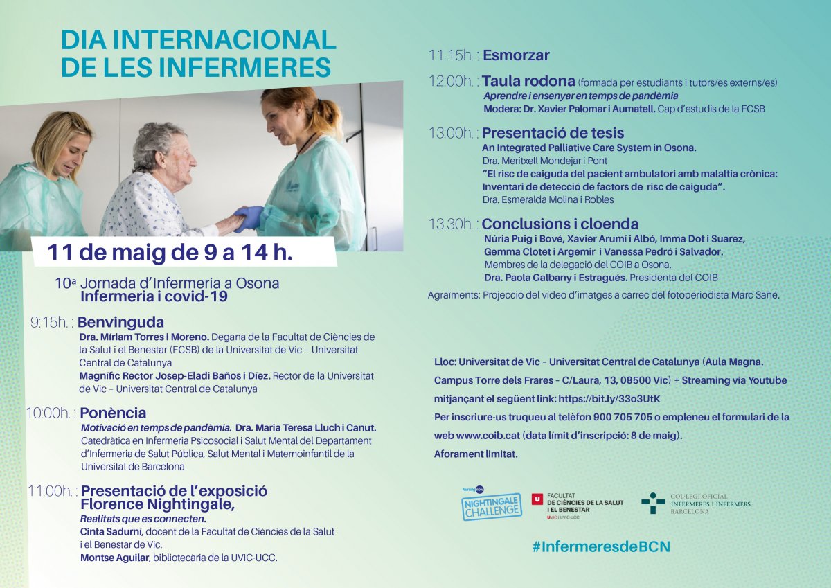 Amb motiu del Dia Internacional de les Infermeres, la Universitat de Vic acull aquest dimarts una jornada sobre la Covid-19 i Infermeria. Després de la benvinguda del rector de la UVic-UCC Josep Eladi Baños i la degana de la Facultat de Ciències de la Salut i el Benestar, Míriam Torres, s’iniciarà la jornada. Comptarà, entre d’altres amb una ponència de Maria Teresa Lluch sobre la motivació en temps de pandèmia, una taula rodona sobre aprendre i ensenyar en temps de pandèmia i la presentació de la tesi de Meritxell Mondejar.