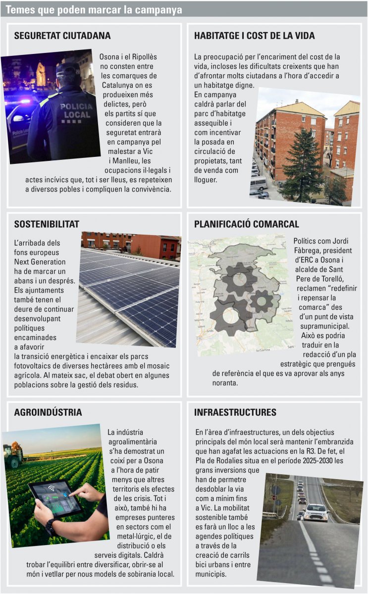 A grans trets, el que sí que comparteixen tots els partits és l’aspiració d’igualar i, si és possible, superar, el nombre de poblacions on van fer llista el 2019. Poyato apunta que en el cas del PSC tenen garantides les places habituals, entre les quals Vic, Manlleu, Centelles o les Masies de Voltregà, però que, a més a més, és molt probable que s’expandeixin amb noves candidatures a Montesquiu, Sant Bartomeu del Grau, Santa Eugènia de Berga o Sant Julià: “Hem de recuperar-nos de situacions complexes i ara toca molta gestió municipal. Parlàvem de desafecció… Entre tots tenim el deure de canviar la tendència i entendre que com a ciutadans posem a mans dels polítics la direcció dels nostres pobles. Si volem bons serveis i tenir dret a queixar-nos, el millor és participar”. Roca coincideix en la màxima de consolidar els equips que ja estan treballant i, a partir d’aquí, arribar a tants municipis com sigui possible, però sense oblidar la prioritat de presentar “llistes competitives als llocs més grans”. A Vic, amb l’anunci que Anna Erra no optarà a un tercer mandat ja s’ha engegat el mecanisme electoral i dijous que ve hi ha prevista l’assemblea local d’afiliats en què es podran postular les persones amb ganes d’encapçalar la candidatura.
