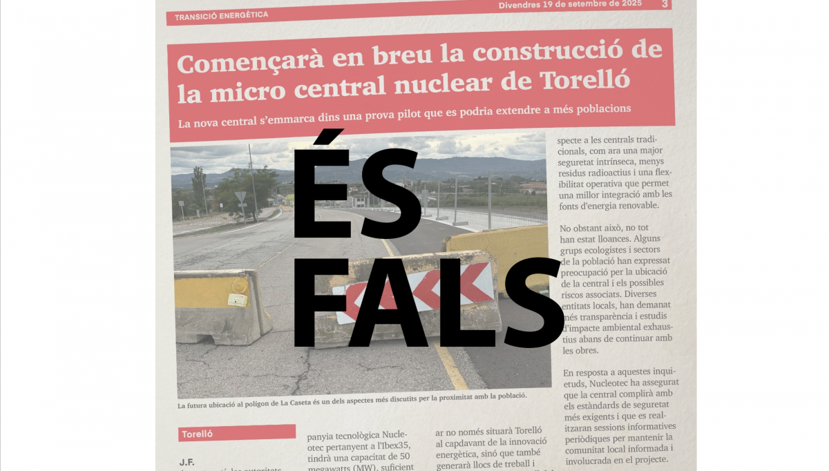 En les últimes hores ha circulat a través de xarxes socials, sobretot en grups de WhatsApp de la Vall del Ges, una imatge simulant un diari imprès amb una notícia que és falsa. La informació parla del projecte de construir una mini central nuclear a Torelló, un projecte que és del tot impossible.