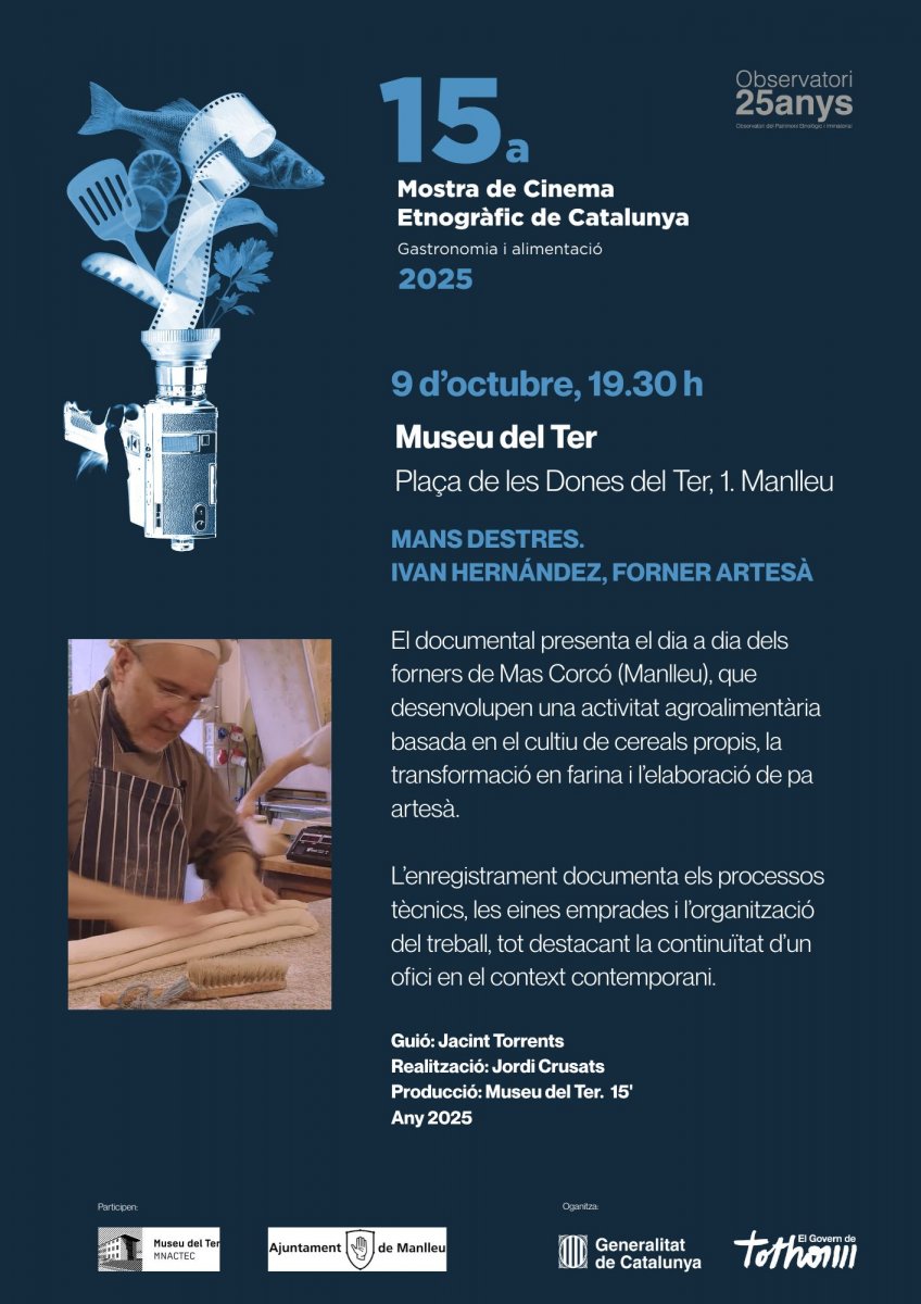 Aquest dijous, a les 19.30h el Museu del Ter acollirà la projecció de: ‘Mans Destres. Ivan Hernández, forner artesà’. Amb Guió de Jacint Torrents i realització: Jordi Crusats. Producció: Museu del Ter. 19’. Any 2025.