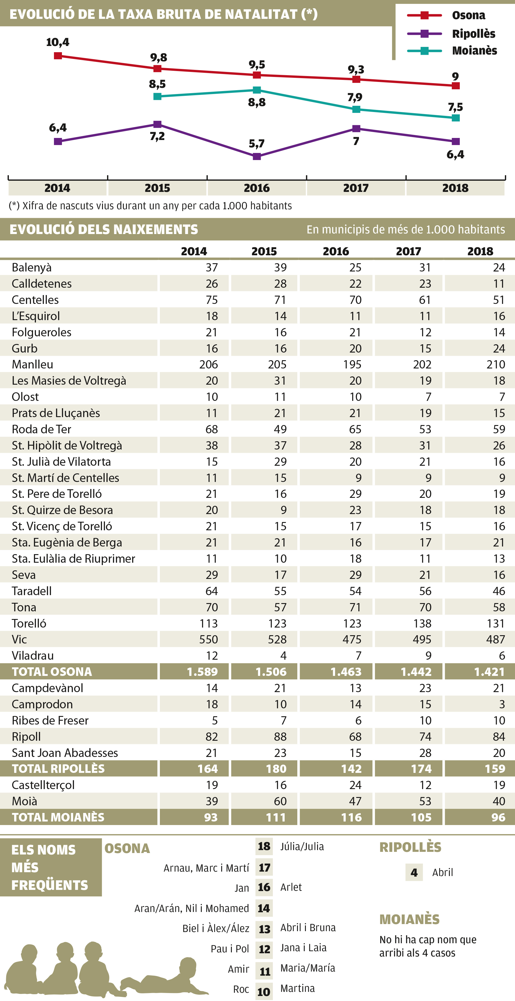 En consonància amb el que s’esdevé a la resta de Catalunya, el nombre de naixements continua caient. Malgrat tot, Osona és una de les comarques que registra un millor comportament. Amb un índex de fecunditat de dues dècimes per sobre de la mitjana catalana, que és d’1,3 fills per dona, i una taxa bruta de natalitat –el total de naixements per cada 1.000 habitants– de 9,03 se situa com la cinquena millor del país el 2018, encapçalada pel Gironès amb 10,5. Tot i això suposa un important descens, que ha estat progressiu des del 10,4 de 2014.