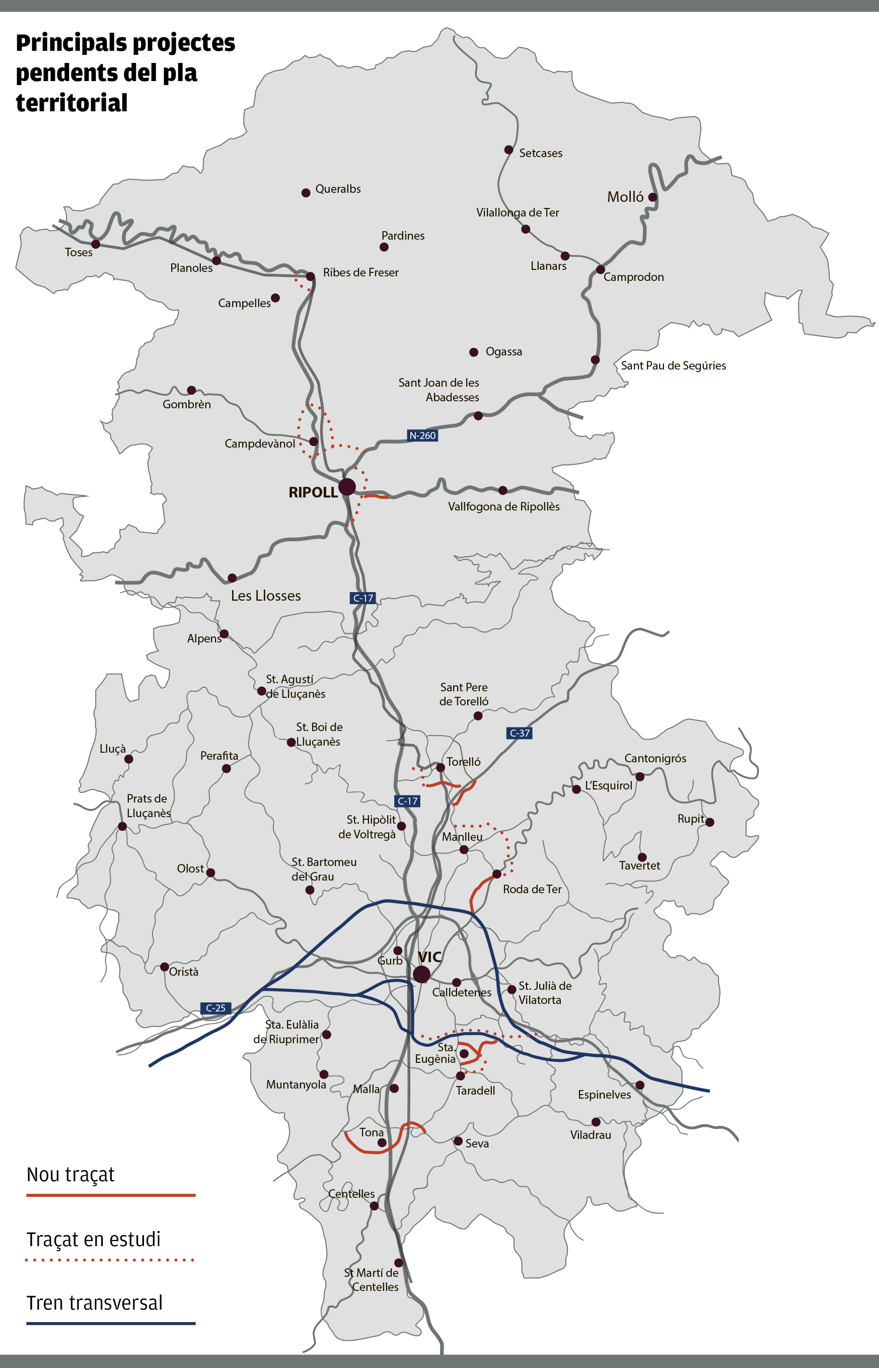 Però el gran projecte faraònic del pla era la línia de tren que havia d’enllaçar Lleida, Igualada, Manresa, Vic i Girona, pressupostat en 2.247 milions d’euros, que circumval·lava la capital d’Osona per davant i per darrere. El projecte s’ha quedat en això, una ratlla sobre el mapa i el desdoblament de la línia Montcada-Vic-Ripoll (que aleshores valia 198 milions) continua sense avançar.