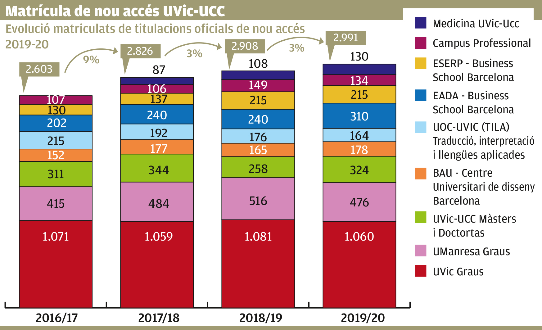 La UVic-UCC tanca definitivament la matrícula d’aquest curs amb un increment del 3% en el nombre total d’alumnes de nou accés. Un increment que prové sobretot dels estudis de postgrau –màsters i doctorats– i d’alguns dels centres adscrits. La matriculació a estudis de grau, en canvi, s’estanca al campus de Vic i baixa lleugerament al de Manresa. Tot i això, aquestes dades són positives si s’observa el context: a Catalunya, els estudis que imparteix la UVic-UCC no tan sols no pugen, sinó que baixen un 4%. “No ens ha de preocupar una lleugera baixada en graus, si creix la matrícula en màsters”, va afirmar el rector, Josep-Eladi Baños, en la presentació dels resultats de matrícula aquest divendres.