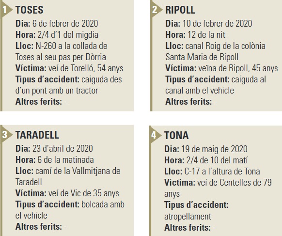 En la resta d’accidents mortals s’ha repetit la peculiaritat que la víctima va ser l’única implicada en els fets. La primera mort vinculada al trànsit del 2019 es va produir el 6 de febrer quan un veí de Torelló, Josep P.P., de 54 anys, es va precipitar amb el seu tractor daltabaix d’un pont a la collada de Toses. Quatre dies després i també al Ripollès, una dona de 45 anys queia amb el seu vehicle a l’interior del canal de la colònia Santa Maria de Ripoll. Els Mossos d’Esquadra van comunicar que el cotxe de la víctima havia evadit i escapat d’un control policial minuts abans de l’accident. El 23 d’abril, en un camí rural del municipi de Taradell, un veí de Vic de 35 anys va bolcar amb el seu vehicle i va perdre la vida.