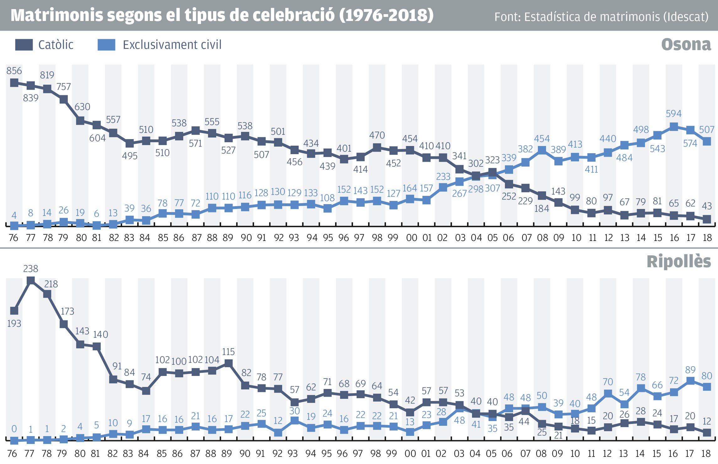 Ara bé, malgrat que arribin més tard, tant a Osona com al Ripollès la xifra de nous matrimonis es manté força estable des de principis del segle XXI, entre 550 i 580 cada any en el primer cas i 85 en el segon. Això vol dir que al Ripollès, on la població ha disminuït en 2.800 habitants en tres dècades, n’hi ha una quantitat similar, mentre que a Osona baixen però no de manera accentuada. El canvi que sí que destaca és en el tipus de celebració, ja que ara mateix de cada deu casaments nou són civils i només un segueix el ritus catòlic.