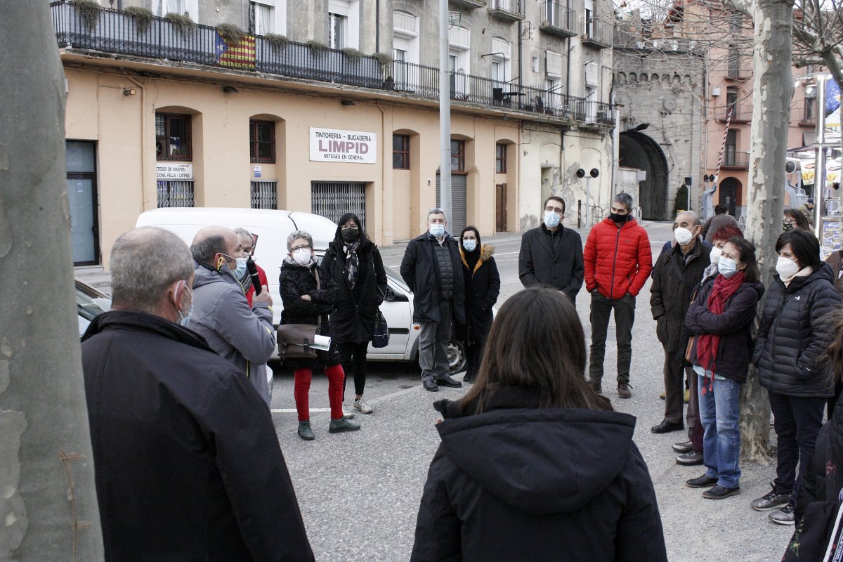El recorregut passava per la plaça de l’Ajuntament, on ara s’està excavant un refugi que es va començar a fer el 1938 i que aviat es podrà visitar. Seguia per l’edifici de l’Elèctrica, on també hi va caure una bomba, i s’aturava a la plaça de la Llibertat, on hi va haver les tres de les 14 víctimes registrades que no eren militars: els germans Puig i Roca, de 13 i 9 anys, i una altra dona del mateix edifici, el número 4, de 47 anys. A la plaça de Sant Eudald el guia mostrava una foto de l’època amb l’edificide la gestoria Munell mig enderrocat i el del banc Santander actual, llavors de benestants, cremat pels republicans. La plaça Gran, relatava, va ser un dels punts on van impactar més bombes, quatre, i hi va quedar un gran cràter al mig.