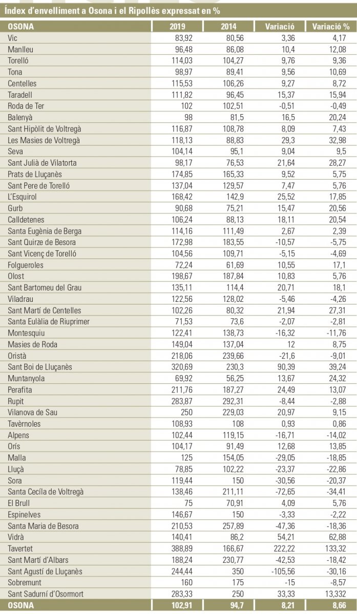 En el 2019, a Osona hi havia 10 municipis amb un índex d’envelliment inferior a 100, sis menys que fa cinc anys, ja que Taradell, Seva, Calldetenes, les Masies de Voltregà, Sant Martí de Centelles i Orís han superat el llindar en aquest període de temps. També és curiós el cas de Lluçà, ja que segons mostren les dades de l’IDESCAT, en els últims cinc anys ha rejovenit la seva població un 22% i ha aconseguit baixar del 100. El municipi que més s’ha rejovenit segons les estadístiques és Santa Cecília de Voltregà (-34%), tot i que la població d’Osona amb un índex d’envelliment més baix és Muntanyola (69%), que en els darrers anys ha experimentat un creixement d’habitants important gràcies a l’arribada de noves famílies. A l’altre costat de la balança hi trobem pobles com Tavertet (388%), Sant Boi de Lluçanès (320%) o Sant Sadurní d’Osormort, amb poblacions molt envellides. Tots ells comparteixen el fet de trobar-se en un entorn rural, sense indústria i poques oportunitats laborals, un fet que dificulta l’arribada de gent jove.