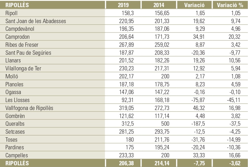 Aquest és precisament un escenari que es repeteix al Ripollès: la població jove marxa a àrees urbanes per buscar oportunitats laborals i al territori hi queda una població envellida. Ara mateix l’índex és de 206%, que vol dir que per cada 100 menors de 16 anys n’hi ha 206 que superen els 64. Els moviments demogràfics en municipis amb pocs habitants com Les Llosses o Queralbs fan que l’índex, tot i mantenir-se molt elevat, marqui una tendència a la baixa a la comarca en el darrer lustre. Serveis com la fibra òptica o el teletreball poden afavorir que gent jove aposti per quedar-se al Ripollès.