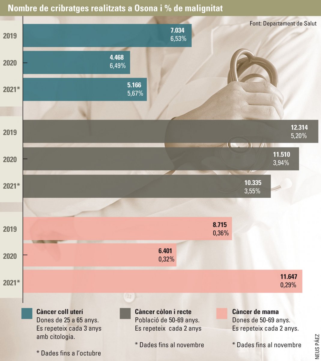 Els cribratges de detecció precoç del càncer han caigut entre un 6% i un 36% a Osona a causa de la pandèmia. Per identificar el de mama, per exemple, l’any 2020 es van portar a terme 6.401 mamografies quan el 2019 se n’havien fet 8.715. Això suposa una reducció del 27%. També es va registrar una davallada de proves en el càncer de còlon i recte, tot i que el descens més marcat, del 36%, correspon al de coll uterí, que es realitza mitjançant citologia a consulta.
