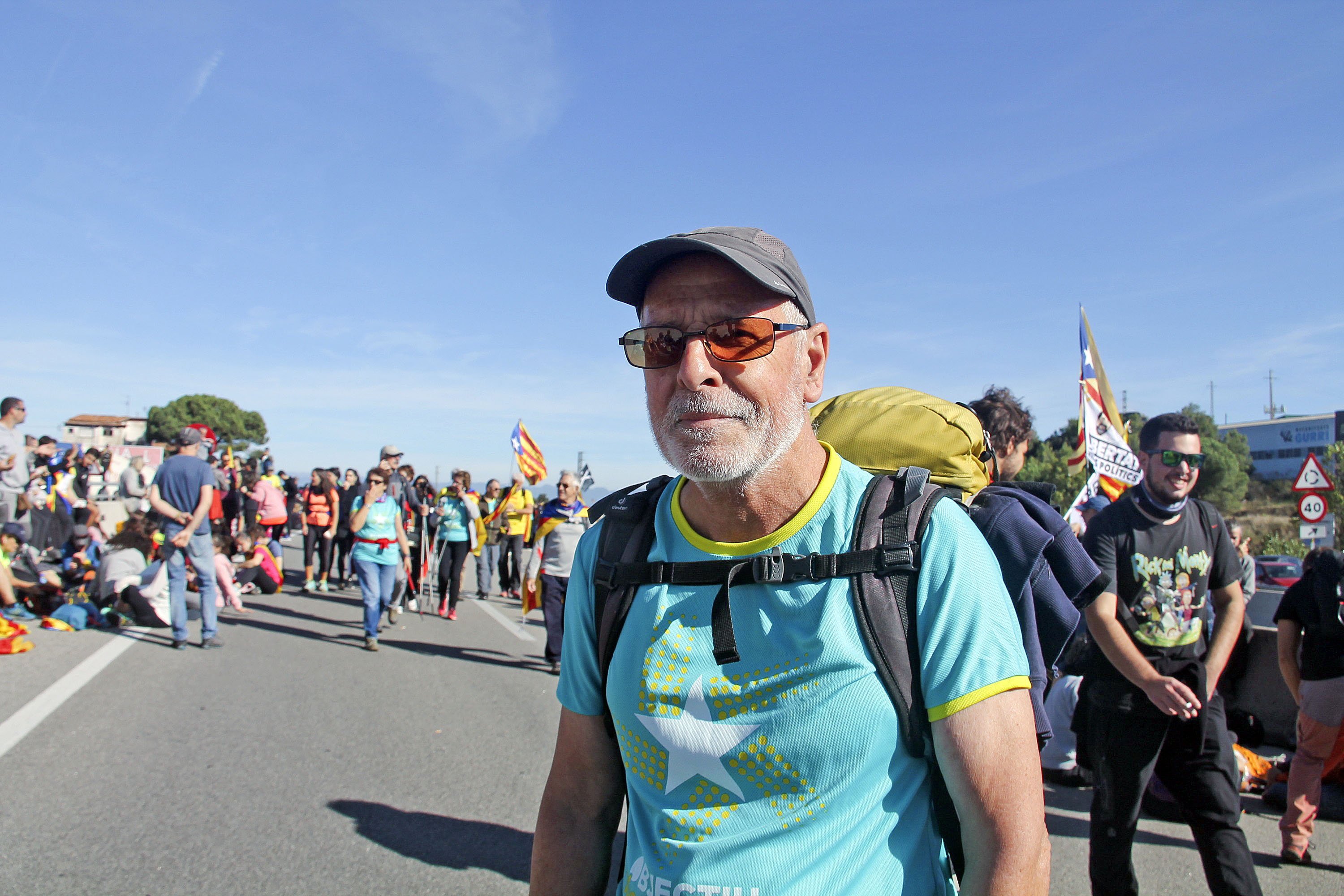 En l’aturada a Tona, un home ha perdut de vista el seu grup de caminants. El sorprenc amb una primera salutació i la seva reacció és contestar que no parla català, “soc francès”, em diu en la llengua del país de l’hexàgon. Em desperta la curiositat, i finalment Gilbert Nemer m’explica què hi fa a la Marxa per la Llibertat: “Soc de Clarmont e Montferrand, i el 2015 amb els bons resultats de l’extrema dreta a les eleccions vaig decidir marxar. Des del 2018 visc a Catalunya, a Vic”. Està disposat a arribar a Barcelona amb un grup de companys, i s’indigna a l’hora de parlar del que està passant al territori que l’ha acollit: “Soc francès i no soc ningú per parlar d’independència sí o no, però la lluita del poble català és normal. Posar a la presó els polítics que ha escollit la població per fer el que els ha demanat la gent, que és votar, és de bojos”, desgrana amb una barreja de català i francès. I és que Nemer s’esforça de valent per matisar del tot el seu posicionament i deixar clara la seva opinió: “No hi ha cap país democràtic al segle XXI que faci això d’empresonar polítics. No és una situació normal. Europa diu que és un problema d’Espanya, però crec que no és cert. És un problema i un atac a la llibertat de tot Europa”. De cop, torna a retrobar-se amb el grup d’acompanyants que havia perdut feia una estona. El criden perquè s’espavili, ja que després de menjar i descansar una mica han decidit arrencar de nou en la part capdavantera de la marxa. Carregat amb el sac de dormir s’allunya ràpid.
