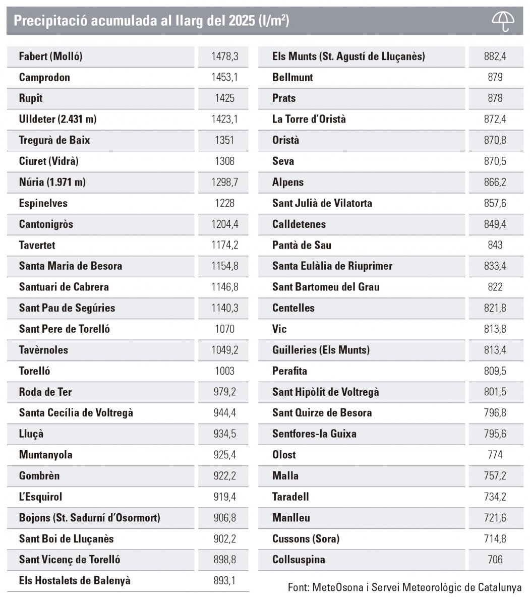 El tancament de l’any confirma un balanç positiu de precipitacions a Osona, el Ripollès i el Lluçanès. “A la Plana de Vic, la mitjana anual és d’uns 700 litres per metre quadrat i, aquest 2025, a tot arreu s’iguala o se supera”, explica Manel Dot, de MeteOsona.