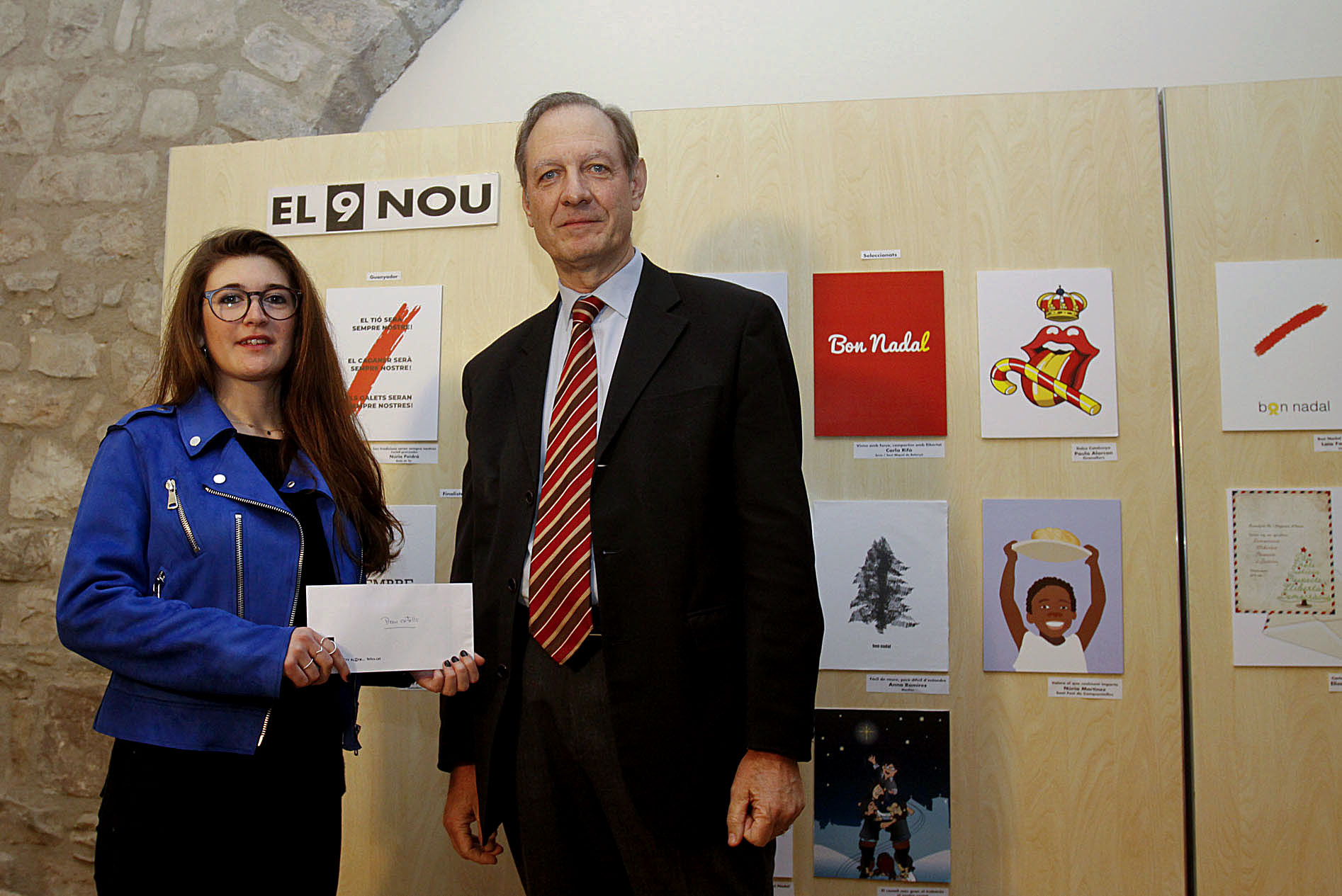 Núria Peidró, de Roda de Ter, va recollir aquest dimecres els 1.000 euros de premi per al seu cartell, guanyador del 34è concurs de portades de Nadal d’EL 9 NOU. El lliurament es va fer a la seu d’EL 9 NOU a Vic, en el marc de la inauguració de l’exposició dels 25 treballs finalistes d’aquesta edició. L’exposició es pot visitar al vestíbul d’EL 9 NOU, a la plaça de la Catedral número 2.
