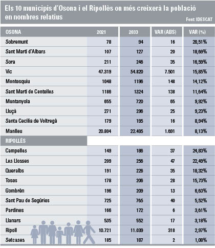 Si ens centrem en les xifres de l’àmbit municipal, a Osona, en nombres relatius, Sobremunt és el poble que més creixeria. L’any 2033 arribaria als 94 habitants, que suposaria una variació del 20,51% respecte al 2021, en què se’n van registrar 78. En nombres absoluts, però, Vic és la ciutat que lideraria el podi i arribaria als 54.820 habitants el 2033, 7.501 més que els que es van registrar l’1 de gener de 2021. Però no només estaria al capdavant en l’àmbit comarcal. De les 25 ciutats més poblades de Catalunya, segons l’Idescat, Vic seria la que més creixeria en nombres relatius. Al darrere hi hauria Castelldefels i Terrassa, amb una variació del 12,91% i 11,89%, respectivament. El municipi d’Osona que perdria més població en nombres relatius seria Alpens. Passaria dels 269 l’any 2021 als 209 el 2033, una variació de -22,30%. En nombres absoluts parlaríem de les Masies de Voltregà, que perdria 253 habitants respecte dels 3.178 que tenia el 2021.