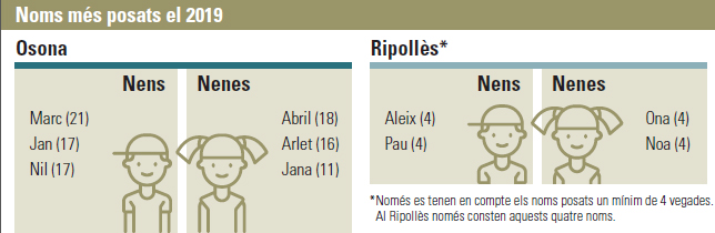 Malgrat les dades i la projecció més aviat negativa, les tendències de la població es mantenen fermes en alguns aspectes, i el més evident és en els noms que més es posen a totes dues comarques. Tot i que arreu de Catalunya destaquen noms no tan freqüents com Leo, a Osona les preferències no varien massa i Marc es torna a alçar com a nom de nen més posat. Pel que fa a nenes, en contra del global català, Abril va aconseguir desbancar Júlia, el nom més posat a Catalunya. Per la seva banda, a la comarca del Ripollès no hi va haver cap nom que destaqués per sobre dels altres, amb un empat entre Aleix, Noa, Ona i Pau, que van ser els únics noms posats més de quatre vegades l’any 2019.