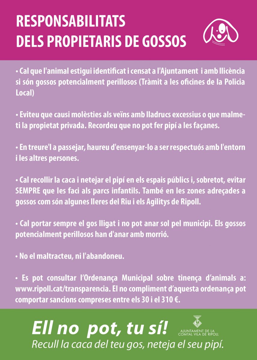 Els cartells, que a part del lema, estan il·lustrats per la fotografia d’un gos i la frase ‘Ell no pot, tu sí!’, es col·locaran a diferents punts de la vila. Aquest dissabte començarà una altra acció que és el repartiment de lots que contenen un kit de bosses per les femtes dels gossos, una ampolla on portar-hi aigua per netejar els pipís i un díptic amb la normativa de responsabilitats per als propietaris dels animals. Els lots es repartiran entre les 11 del matí i la 1 del migdia al Mercat Munciipal, entre les places Gran i Sant Eudald. Aquest és el catell: