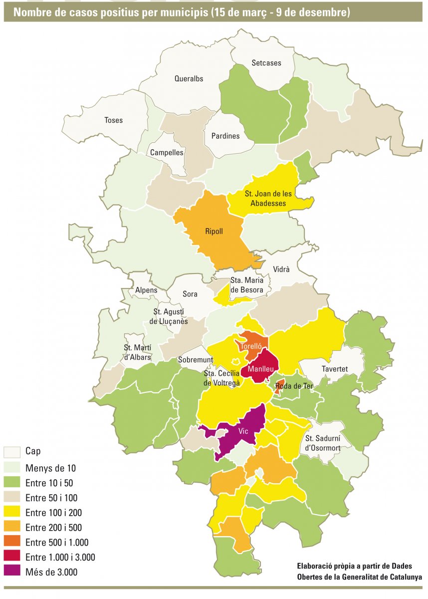 Osona acaba de superar els 9.900 casos de coronavirus i el Ripollès s’aproxima al miler, però les dades del Departament de Salut assenyalen que entre totes dues comarques encara hi ha 15 pobles que es mantenen inexpugnables a l’embat de la Covid-19. Es tracta d’Alpens, Sant Agustí de Lluçanès, Sant Martí d’Albars, Sant Sadurní d’Osormort, Santa Cecília de Voltregà, Santa Maria de Besora, Sobremunt, Sora, Tavertet, Vidrà, Campelles, Pardines, Queralbs, Setcases i Toses, que comparteixen la idiosincràcia de tenir pocs habitants –cap supera els 280–, una població relativament dispersa i ni gaire bars ni botigues on interactuar socialment. Tot això, sumat al compliment de les mesures de prevenció per part dels veïns i un descens del nombre de visitants, ha contribuït a fer d’aquests pobles reductes lliures de Covid-19, almenys segons les dades que reflecteixen les estadístiques, però evidentment l’atzar també hi ha jugat el seu paper, ja que altres municipis amb els mateixos atributs sí que han registrat casos positius.