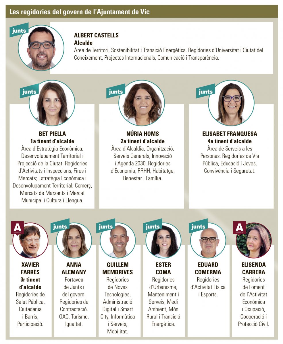 El govern municipal de Vic va agafant múscul, i aquesta setmana s’ha arribat a un acord entre Junts i Ara Vic per definir quines funcions tindran els 10 regidors de la coalició. Amb l’alcalde Albert Castells al capdamunt de l’organigrama, l’Ajuntament estarà dividit en quatre grans àrees, encapçalades pel pinyol del govern municipal, amb exclusiva presència de Junts: Albert Castells, Bet Piella, Núria Homs i Elisabet Franquesa seran les persones que les presidiran, coincidint amb les figures amb més experiència –són l’alcalde i tres tinents d’alcalde– entre la desena de regidors. Qui també fa un pas endavant en aquest mandat respecte a l’anterior és Anna Alemany. La regidora manté quatre regidories, però assumeix el paper de portaveu del grup municipal de Junts, així com també una nova figura al consistori: portaveu del govern de Vic.