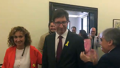 El gurbetà Carles Mundó, conseller de Justícia al govern de Carles Puigdemont, ha fet el traspàs de carteres a Ester Capella aquest matí. Tant un com l’altre han estat rebuts i acomiadats entre aplaudiments. La nova consellera, fins ara diputada d’ERC a Madrid, també li ha volgut agrair la feina feta. “Això ja no és un Departament gris i invisible. És un Departament que va adquirir color amb Carles Mundó al capdavant”, ha assegurat.