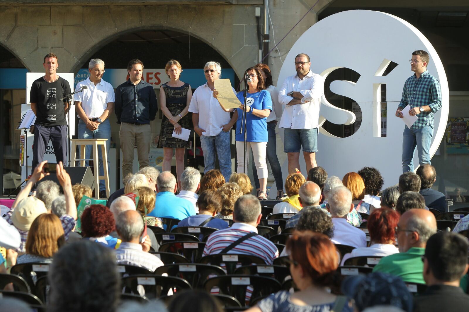 Vic ha celebrat aquesta tarda l’acte unitari de la Taula de Vic d’entitats i partits pel “sí” al referèndum quan, precisament ahir mateix, el president de la Generalitat en va anunciar la data i pregunta. Malgrat la calor i el sol que queia, la plaça Major s’ha omplert de gent.