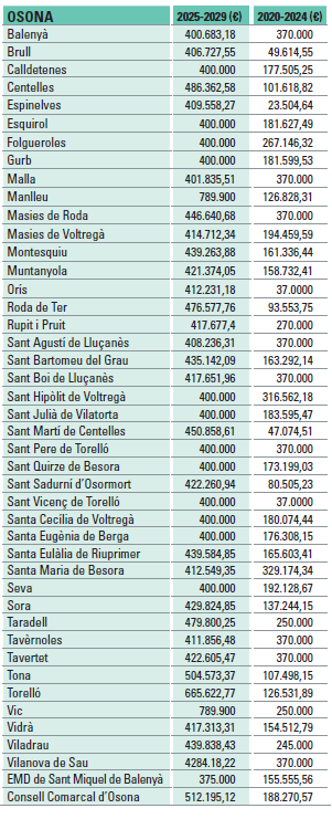 La consignació que aportarà a les nostres comarques entre ara i el 2029 és de 31,768 milions d’euros: 19,59 a Osona, 8,84 al Ripollès i 3,34 al Lluçanès. Un mínim de 400.000 euros per a cadascun dels ajuntaments –l’EMD de Sant Miquel de Balenyà, 375.000– i 512.195 per als consells comarcals.