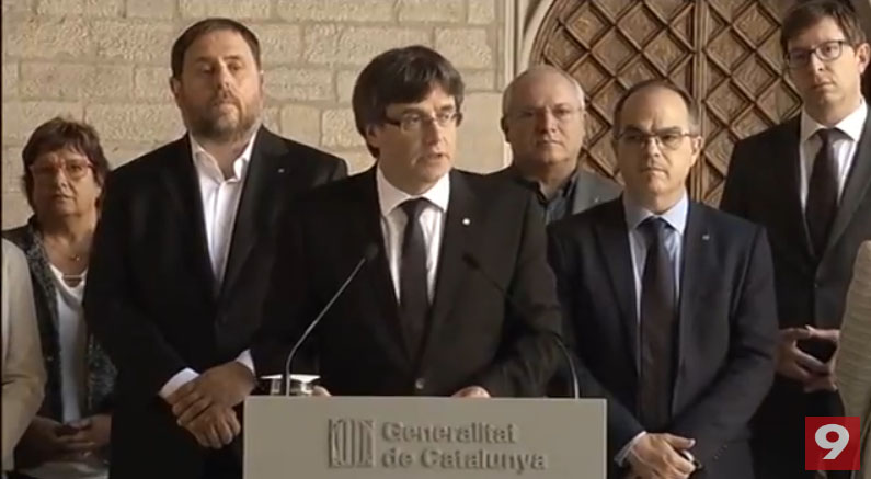 El president de la Generalitat, Carles Puigdemont, ha assegurat que l’Estat espanyol “ha suspès de facto l’autogovern i ha declarat un estat d’excepció”. Puigdemont ha fet aquestes declaracions en una compareixença acompanyat per tots els membres del govern després que la Guàrdia Civil hagi escorcollat les seus de diversos departaments de la Generalitat i hagi detingut alts càrrecs del govern. Puigdemont ha qualificat l’acció “d’inacceptable en democràcia”.