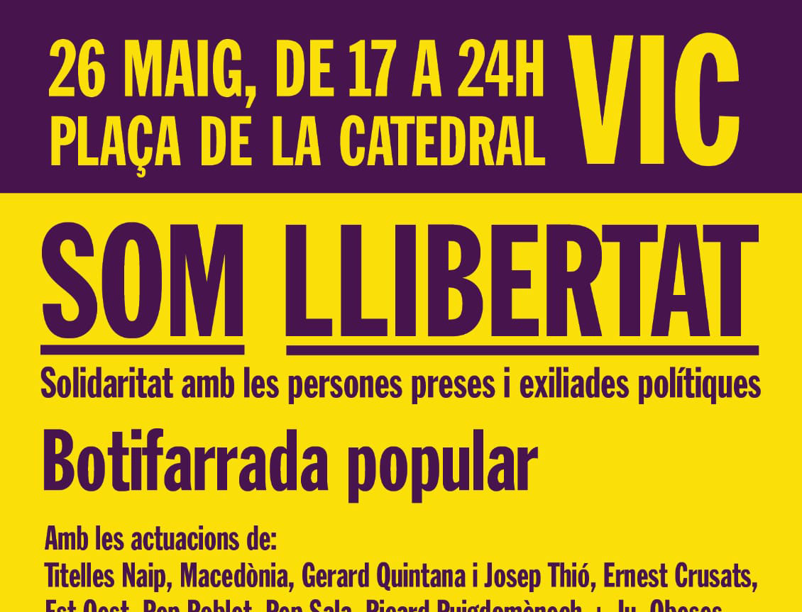 L’acte, organitzat pel Moviment 30/03, porta el títol de Som libertat, i a part de ser un acte de suport a la vigatana Marta Rovira també ho serà per a tots els presos i exiliats polítics. Les acutacions aniran a càrrec de la Companyia Elèctrica Dharma, Gerard Quintana i Josep Thió, Obeses, Macedònia, Mathew McDaid, Guillem Ramisa, Pep Sala, Ricard Puigdomènech+Ju, Pep Poblet, Est Oest, Ernest Crusats i Titelles Naip. També han confirmat la seva assistència el president del Parlament de Catalunya, Roger Torrent; Empar Moliner, Antonio Baños, Carles Mundó, Sílvia Bel, Jenn Díaz, Albano-Dante Fachin, Ivan Benet, Jordi Margarit, José Rodríguez i Peyu, entre d’altres. Es farà a les 5 de la tarda i s’allargarà fins a les 12 de la nit a la plaça de la Catedral de Vic.