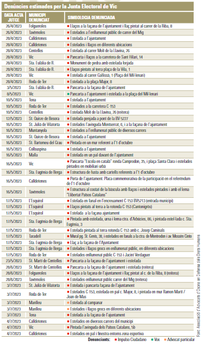 Des de les eleccions municipals s’ha disparat el nombre de demandes interposades als consistoris per retirar símbols independentistes. La majoria provenen d’una mateixa entitat, Impulso Ciudadano, que assegura defensar la neutralitat institucional. A Osona s’han presentat una cinquantena de denúncies entre abril i juliol a un total de 18 municipis, i durant la contesa municipal hi va haver recurs en 8 de 36 casos
