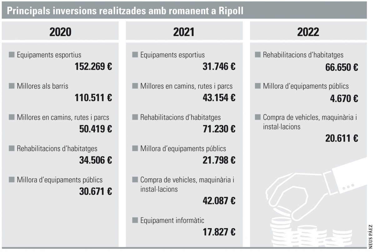 I és que tal com detalla, sense deixar d’executar obres, han pogut amortitzar anticipadament uns 6,5 milions d’euros en préstecs: 2 milions el 2020, 2,5 el 2022 i 2 més el 2023. Hi afegeix, això sí, que la incorporació de romanent no és gratis, en el sentit que demana múscul: “Se’t deixa gastar el que vulguis, però igualment necessites estructura per fer tota la gestió, activitat o control. Pots dir anunciar un nou carrer nou, però s’ha de redactar un projecte i això vol dir mans, recursos humans”.