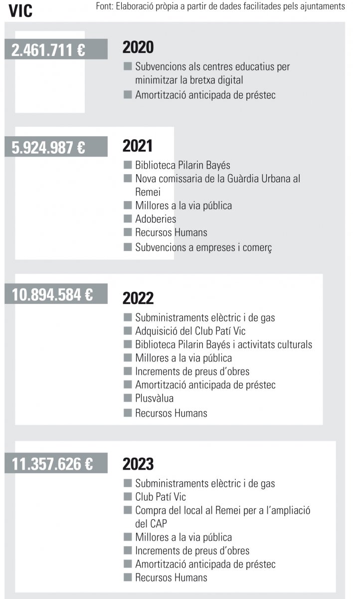 La irrupció de la pandèmia, l’any 2020, obria un nou capítol. Més flexibilitat. I, en concret, que els consistoris tinguessin màniga ampla a l’hora de decidir a què dedicar els estalvis. Tal com recull la taula, a més a més de subvencions per pal·liar els efectes del coronavirus, durant quatre anys això ha permès a Vic, Manlleu o Ripoll tirar endavant actuacions molt variades, fins i tot renovar material informàtic o pagar obres. EL 9 NOU havia demanat les mateixes dades a Torelló, però a l’hora de tancar l’edició d’aquest dilluns no havia estat possible obtenir-les.