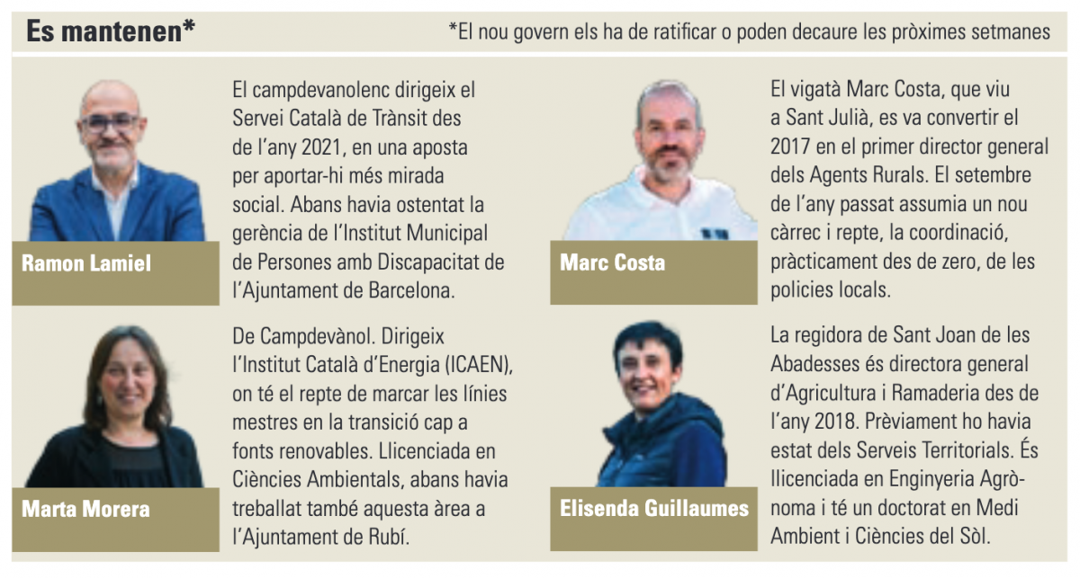 Dos s’hi han incorporat aquesta legislatura –Òscar Ordeig i Josep Maria Garcia Balda, originaris de Vic i Ripoll– i quatre continuen d’etapes anteriors: la santjoanina Elisenda Guillaumes, que de moment no està cessada però espera relleu a la Direcció General d’Agricultura i Ramaderia; i Ramon Lamiel (Servei Català de Trànsit), Marc Costa (Coordinació de les Policies Locals) i Marta Morera (Institut Català de l’Energia), que semblaria que tenen números de mantenir responsabilitats malgrat el canvi de color polític.