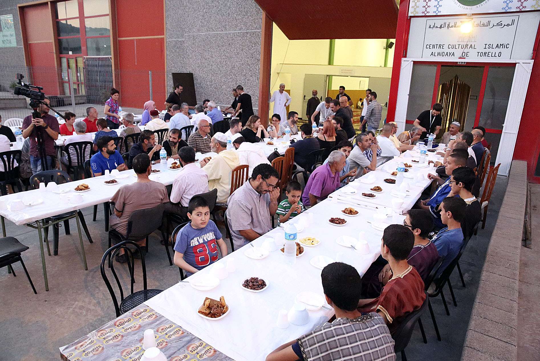 Passaven de les 9 del vespre de divendres i era el moment de trencar el dia de dejuni del ramadà al Centre Cultural Islàmic Alhidaya. A diferència dels dies previs des que va començar, el 27 de maig, aquesta vegada hi havia convidats: membres d’entitats diverses de Torelló; l’alcalde i altres regidors; el rector Joan Torra, i el director general d’Afers Religiosos de la Generalitat. Amb aquesta trobada, que fan cada any, obrien les portes del centre cultural a tothom qui tingués ganes de conèixe’l d’a prop.