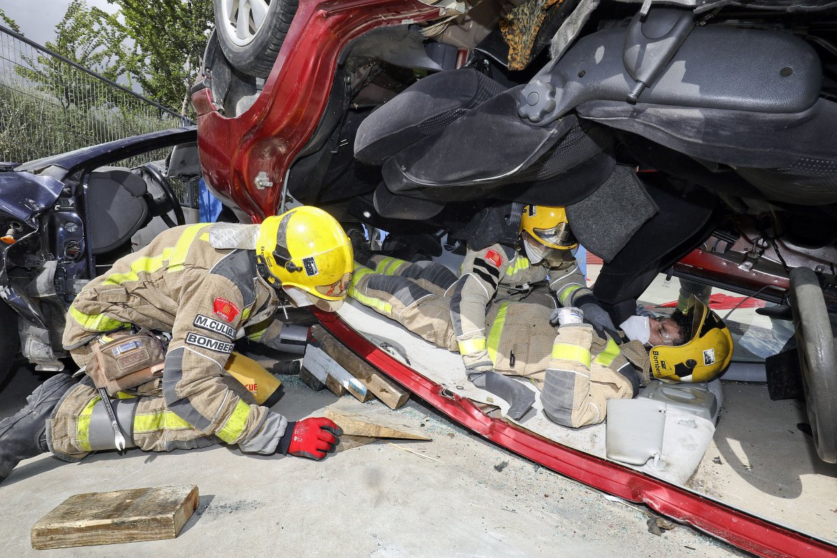 Els bombers arriben al lloc del sinistre i es troben el següent escenari: dos vehicles implicats després d’un xoc que ha comportat la bolcada total d’un d’ells. El protocol d’actuació és ben clar. En primer lloc, detectar si hi ha persones atrapades en la ferralla. En aquest cas, el conductor ha quedat encaixonat a la part del copilot. “Som els bombers. Si ens escolta faci un crit!”, alerta el bomber sanitari. La víctima respon afirmativament. Mentre es produeix aquest petit diàleg la resta de l’equip d’actuació fa una volta de 360 graus al vehicle. L’objectiu és detectar possibles riscos –com una fuga de carburant o algun element que suposi una amenaça en l’inici del rescat– i anul·lar-los al més ràpid possible. Després del reconeixement, passen a l’acció. Cal arribar a la persona ferida. Els bombers detecten un possible punt d’entrada a la cabina del cotxe a través del vidre del maleter. Asseguren l’estabilitat del vehicle i dos bombers s’introdueixen a l’interior. Amb la seva presència ofereixen seguretat i confiança al ferit. Li aniran explicant tot el que passarà en els següents minuts.