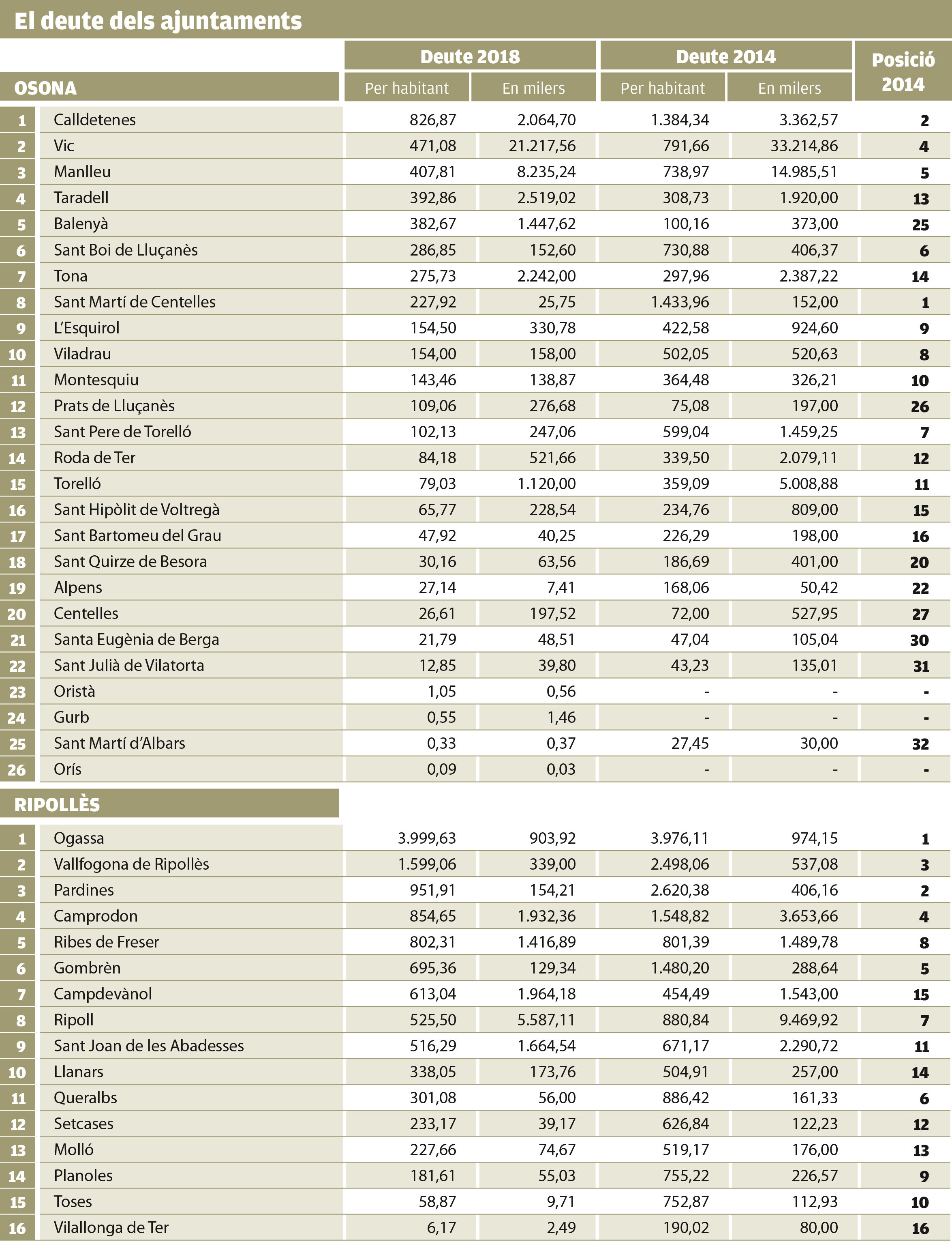 Si s’hagués de fer un titular genèric de l’evolució de les finances dels ajuntaments d’Osona i el Ripollès durant l’últim mandat segurament la idea que generaria més consens seria la de la notable reducció del deute bancari. Segons les últimes dades disponibles al Ministeri d’Hisenda, corresponents al 31 de desembre de l’any passat, el deute viu conjunt dels ajuntaments d’Osona s’ha reduït un 42% respecte al de quatre anys abans (de 71,75 milions el 2014 a 41,32 el 2018) i el del Ripollès, un 33% (de 21,80 milions a 14,50). Aquesta disminució no es produeix per cap conjunció astral, sinó que té molt a veure amb el marc legal: la Llei d’Estabilitat Pressupostària i Sostenibilitat Financera (LOEPSF) colla els ajuntaments.