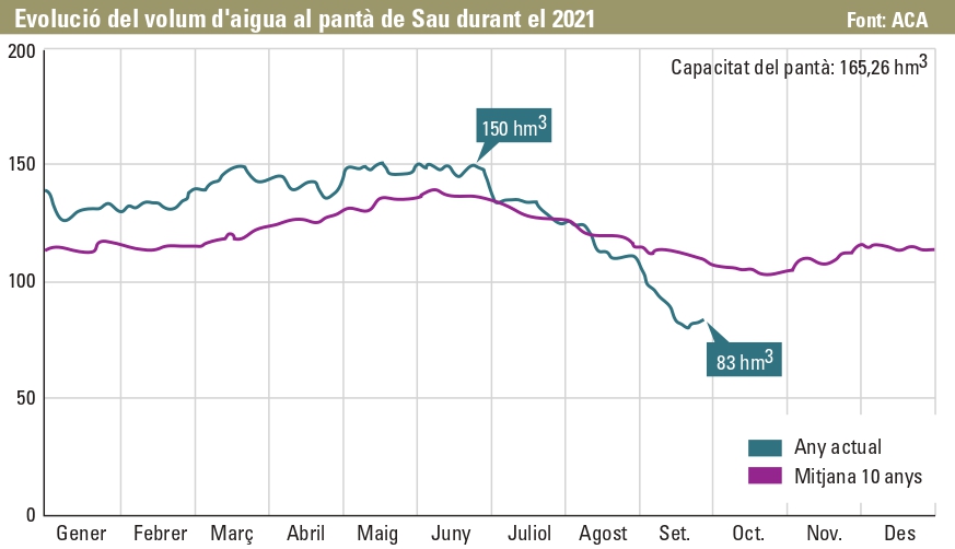 Una de les peculiaritats del sistema d’embassaments de Sau, Susqueda i el Pasteral –vinculats tots ells al riu Ter– és que permet jugar amb el nivell de l’aigua entre ells. Així doncs, amb l’objectiu d’optimitzar els usos que permeten aquests pantans es gestiona el nivell d’emplenament en funció de l’estació de l’any, la meteorologia i l’optimització de les funcions que són possibles amb l’aigua que s’hi reserva: abastir el subministrament a la població, mantenir el cabal ecològic del riu i generar energia hidràulica. Aquest estiu, tot i no ser una campanya molt plujosa tampoc s’han encès les alarmes per la sequera. De fet, a finals de juny, les reserves de Sau van assolir una punta de 150 hm3 (90%), segons el gràfic d’evolució de l’Agència Catalana de l’Aigua (ACA). A partir d’aquell moment, i motivat per la reducció dels episodis de pluja i el manteniment de la demanda de captació per a ús de boca, el volum d’aigua de Sau va començar a baixar progressivament. A principis d’agost va deixar enrere la línia de la mitjana d’emplenament dels últims 10 anys. La imatge més sorprenent, però –Sau és un dels punts més visitats i fotografiats d’Osona–, s’ha produït aquest setembre, quan la caiguda del volum d’aigua s’ha accentuat. Aquest dimecres, l’ACA publicava que el nivell d’aigua a Sau era de 83 hm3, el que representa la meitat de la seva capacitat total (165 hm3) i un 45% menys de la que hi havia ara fa tres mesos. La capacitat també és inferior a la que hi havia ara fa un any (78%), així com la mitjana dels darrers cinc anys (64%) i de l’última dècada (65%).